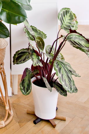 Les calathea s'habillent de différentes motifs très graphiques et ornementaux. On aime cette plante pour ses feuilles dont le revers est d'un pourpre profond. Et en plus, l'entretien est très facile.