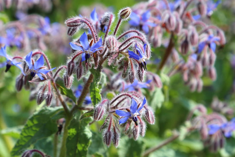 La bourrache pousse souvent d'elle-même au milieu des potagers, sans même qu'on ait besoin de l'y inviter. Cet engrais vert a de nombreux avantages et on peut en faire du purin. En cuisine, on mange ses fleurs et ses jeunes feuilles, ciselées en salade. On peut même en faire des soupes. Cette fleur croquante a une saveur iodée qui rappelle celle du concombre.