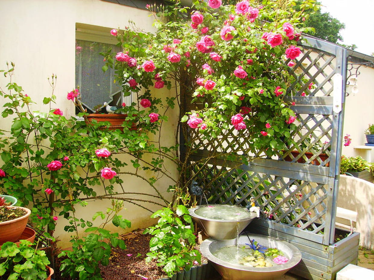 Près de cette petite fontaine en inox à deux étages, on profite de ce véritable havre de paix en écoutant le clapotis de l'eau qui coule et en admirant les roses qui s'épanouissent.