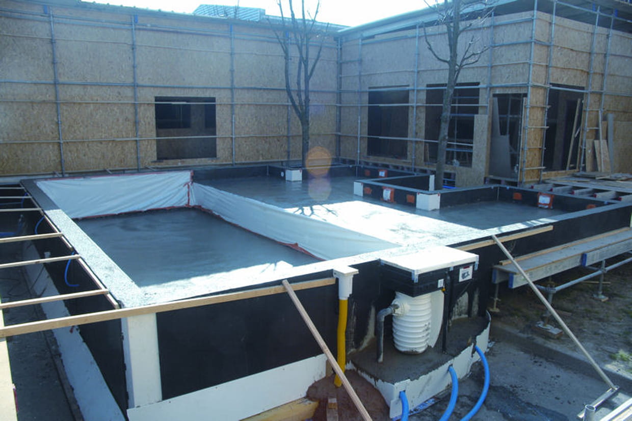 Le béton a rempli intégralement la piscine, au centre et sur les bords. On commence à deviner sa forme. On peut déjà remarquer les deux niveaux.