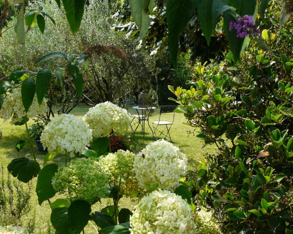 Dans ce jardin du Vaucluse, on retrouve des hortensias, de la lavande, des géraniums ainsi que des impatiences. Différentes couleurs se fondent dans cette masse de verdure et rendent les déjeuners sur l'herbe enchanteurs.