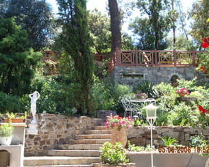 Avec son belvédère donnant sur la nature environnante, ce jardin de 1 000 m² s'étend sur plusieurs niveaux. Le propriétaire des lieux y cultive des plantes aromatiques, de la lavande, des iris, des gazanias, des plantes méditerranéennes, des dahlias ou encore des yuccas. Au détour de cette végétation foisonnante, se trouve même un bassin sur deux niveaux.