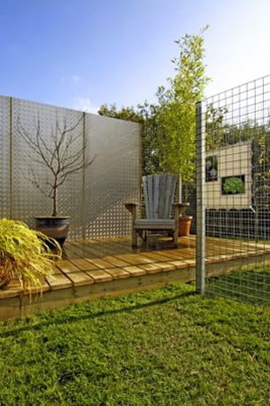 Sur les claustras métalliques en fond de jardin, on peut imaginer projeter avec ses amis, sa famille des photos ou des vidéos sur des bâches tendues. Ici des exemples de sérigraphie ont été installés, donnant au jardin des allures de galerie d'art. Le jardin est perçu comme un lieu à vivre et à partager.