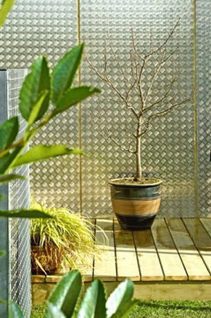 Des grilles de métal bordent la terrasse, complétées par des écrans latéraux et une toile métallique. Cette association permet de jouer avec la lumière aux différentes heures du jour. Ce jardin mise également sur les perspectives et les niveaux, grâce à une hauteur de terrasse de 17 cm, en pin de Scandinavie traité. L'installation d'un écran d'aluminium permet à la lumière de s'y réfléchir et d'illuminer la terrasse en bois.