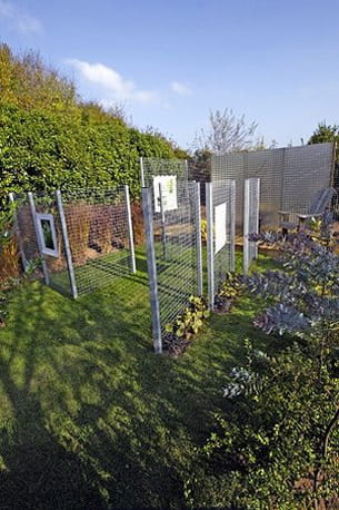 Il est vrai que le choix des claustras métalliques peut surprendre. Lorsque les plantes situées à leurs pieds se seront développées, le résultat sera bien différent. Les grimpantes adultes comme des clématites (Clematis 'Blue Angel' et Clematis 'White Magic' notamment) et es Alchemillas mollis de belle taille ont pour dessein de diminuer sensiblement l'effet métal. Le fond du jardin en aluminium illumine l'espace dès les premiers rayons du soleil, réfléchit la lumière sur les différents modules du jardin et crée des effets d'ombre et de lumière très intéressants.