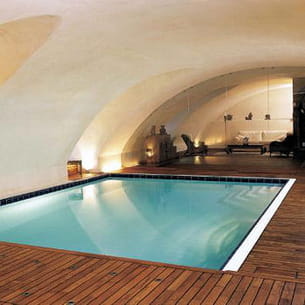 Sous l'ambiance intime et chaleureuse des voûtes, cette majestueuse piscine intérieure est facilement accessible avec son escalier d'angle. Le revêtement en carrelage est souligné par la plage en teck, posée en pont de bateau.