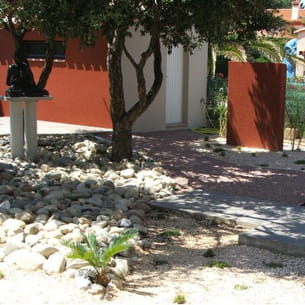 Tous les détails comptent. Il a donc fallu soigner les allées et les éléments décoratifs du jardin. Ainsi, l'allée menant du cabanon à la buanderie a un tracé sinueux. Elle est délimitée par des bordures en aluminium souple. Stéphane s'est servi d'un gravier marbre rouge pour la recouvrir afin de faire écho au rouge des murs de la maison, du cabanon ou des brise-vues. Le gravier blanc installé notamment tout le long de la barrière du voisin a vocation à disparaitre au fil des années. Des plantes couvre-sols, que l'on peut apercevoir sur la photo sous forme de touffe verte, se développeront avec le temps et à terme, elles tapisseront le sol complètement. Elles ont une jolie couleur verte en été et marron en hiver.