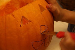 Maintenant, vous pouvez découper les éléments du visage. Les yeux, le nez, la bouche... Tout y passe. Là encore, c'est un adulte qui se charge de cette étape pour éviter que les enfants se blessent. Pour celles et ceux qui voudront mettre une bougie à l'intérieur de la citrouille, pensez bien à réaliser des ouvertures assez grandes pour que "votre monstre" brille bien dans la nuit.