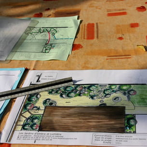 Dans un premier temps, Laurent Sagne, paysagiste et responsable de l'entreprise "Les Jardins d'Ombre et Lumière" rencontre son client, Jean-Paul, propriétaire d'une maison en Ile-de-France. L'objectif est de visualiser l'espace disponibles et de saisir les attentes de son client. Lors de notre reportage, le plan était déjà élaboré et les travaux commençaient. On peut d'ores et déjà voir la place que va prendre la terrasse, passant à 24 m². Elle sera recouverte de bois, afin de s'intégrer parfaitement à l'environnement futur du jardin. L'aménagement en gravier occupera la majeure partie du jardin japonais, devant la terrasse. Puis on aperçoit en arrière-plan l'évocation de l'enrochement, des plantes, de la fontaine et de la lanterne.