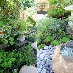 La partie végétalisée est constituée de plantes persistantes, des feuillages rouges et verts, un azalée du Japon qui fleurira au printemps, un mahonia, un camélia blanc, un rhododendron nain, un conifère nain et l'hortensia qui a conservé sa place initiale.