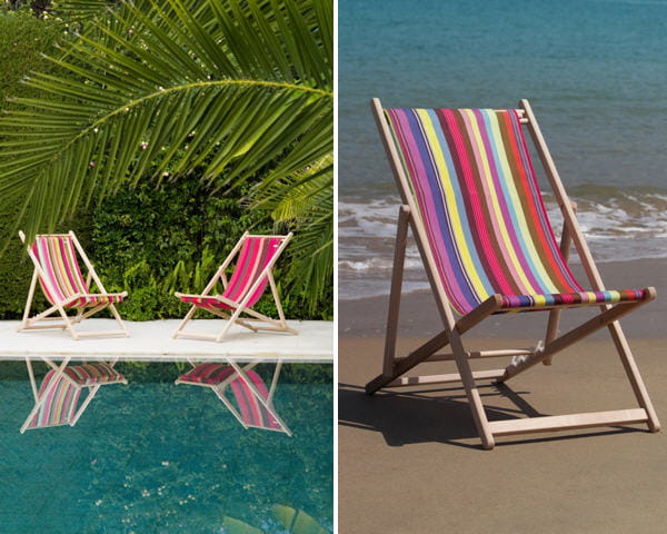 Pour un esprit bord de mer dans votre jardin, optez pour ces authentiques transats. Avec leur structure en hêtre et leurs toiles aux rayures bayadères multicolores, vous vous sentirez comme dans le sud.
