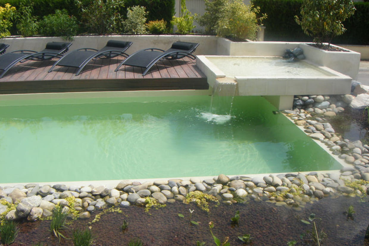 Ainsi agencé avec une baignade naturelle, le jardin prend une allure contemporaine, tout en restant coordonné avec les matériaux utilisés dans un cadre plutôt traditionnel, celui d'un lotissement en pierres de taille. Respectueux de l'environnement, la baignade naturelle vit été comme hiver du fait du biotope qui l'entoure.