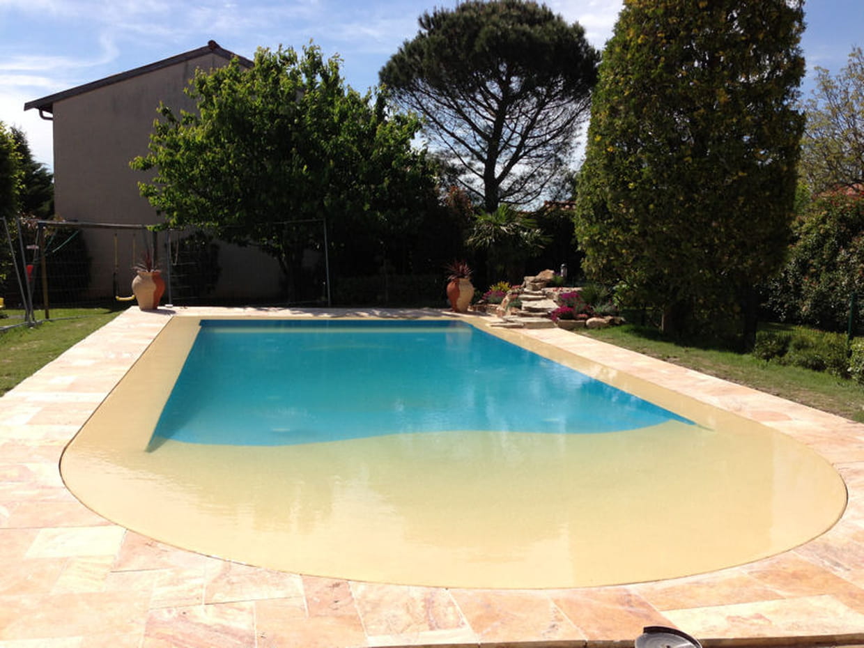 Avec cette autre réalisation, la piscine se fond dans le paysage du jardin. L'eau affleure et déborde de la plage autour de la piscine, créant un effet miroir.