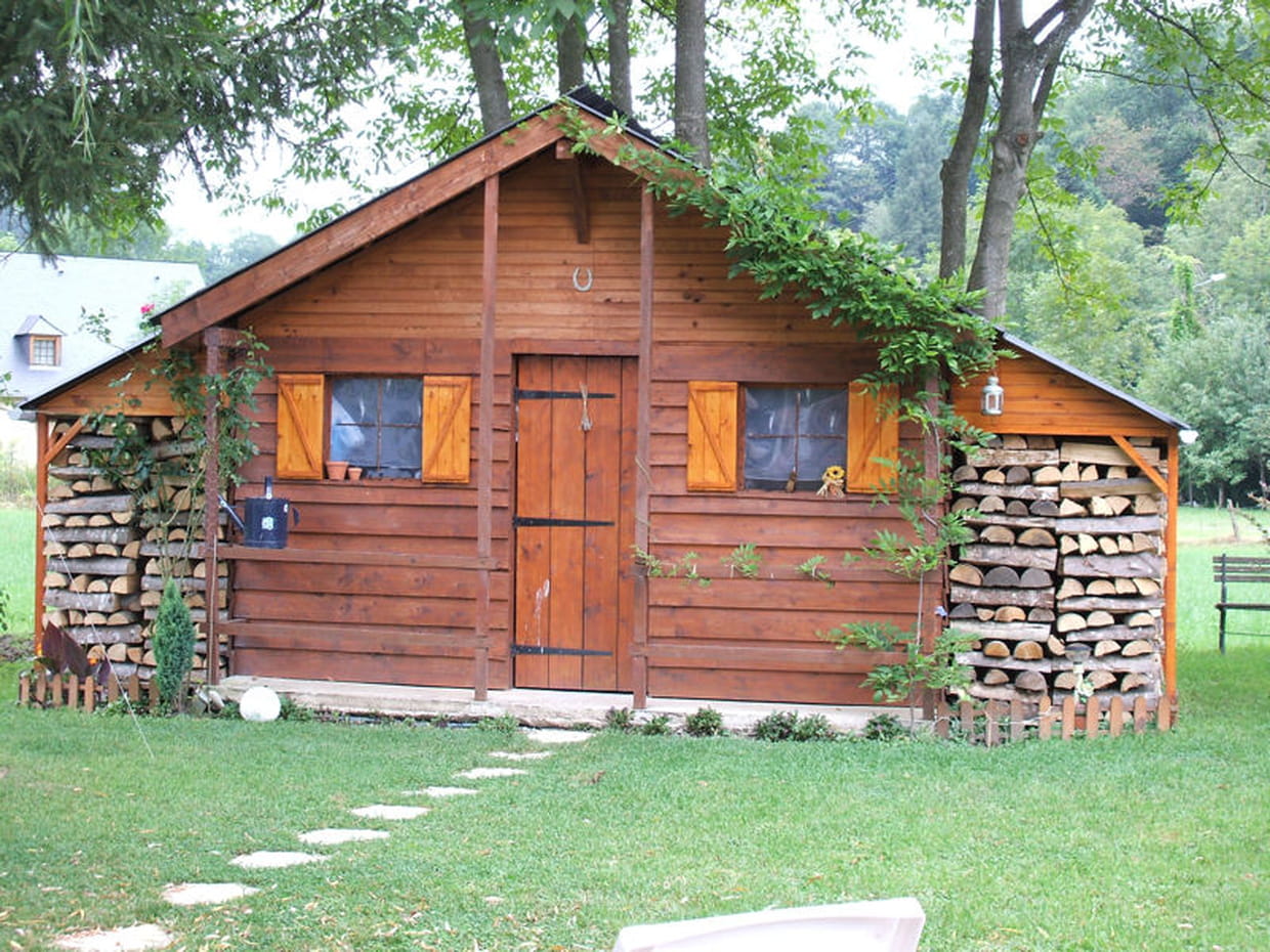 Flanquée de deux abris à bois et habillée d'une glycine, cette cabane de jardin est une véritable petite maison dans la prairie !