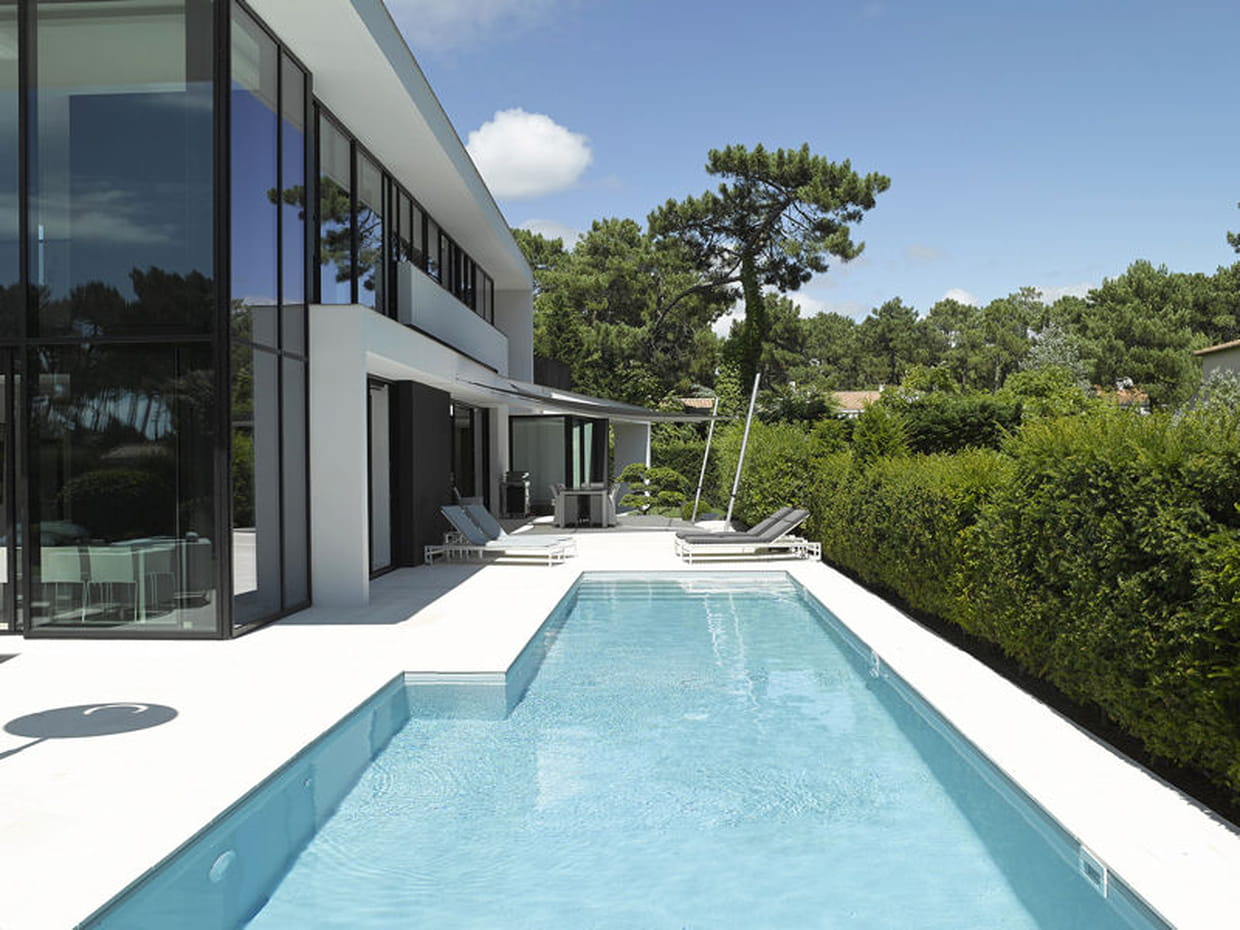 Adossé à une maison contemporaine, ce couloir de nage, par ses formes géométriques, ses matériaux sobres (pierre reconstituée notamment) et ses couleurs, est en parfaite harmonie avec le cadre architectural de la propriété.