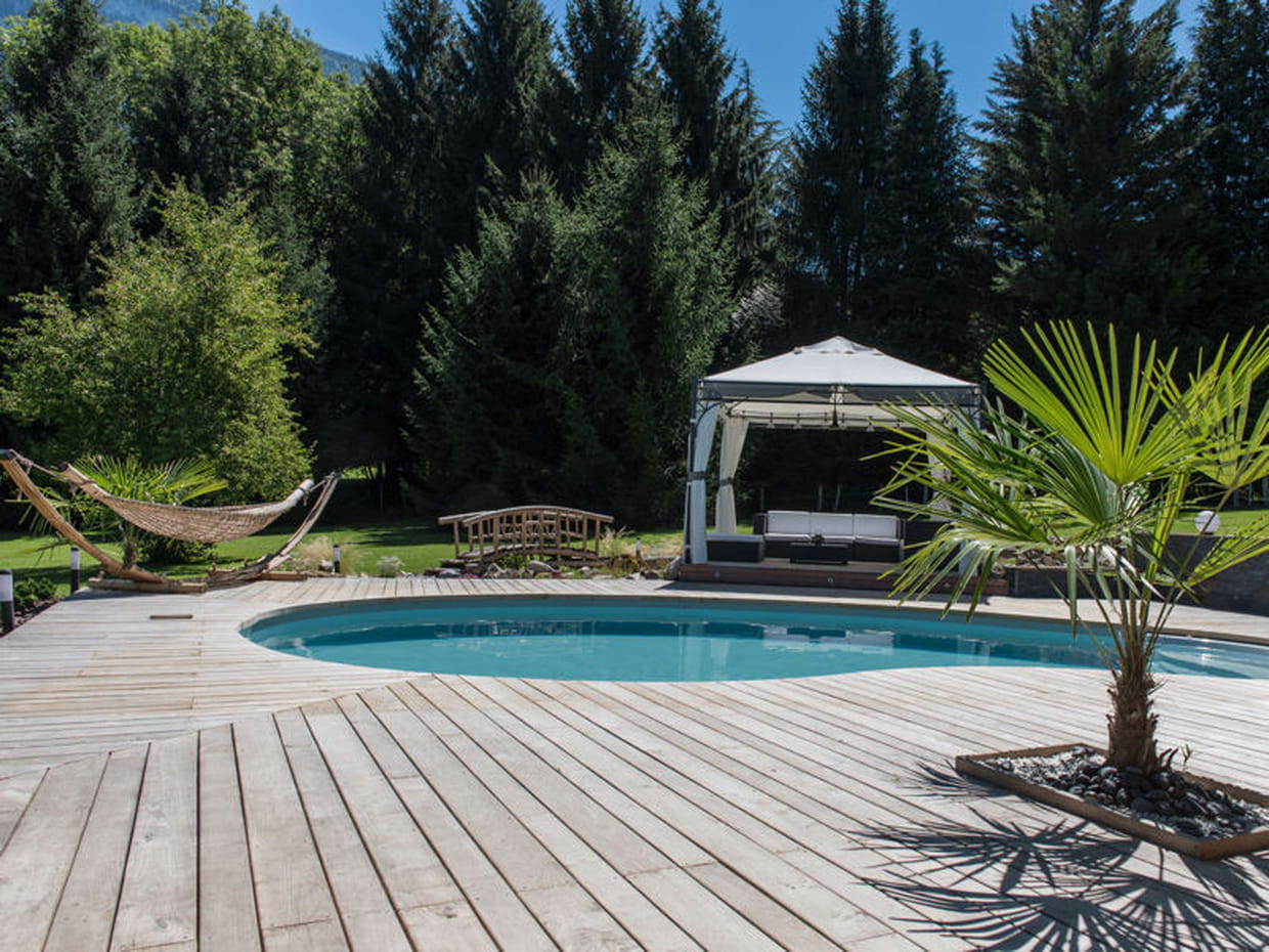 Cette piscine en kit (modèle Eva de la marque Waterair) a été montée par un particulier. Ses lignes courbes, sa plage en bois blanchi et le mobilier qui l'accompagne en font un espace de détente assurée.