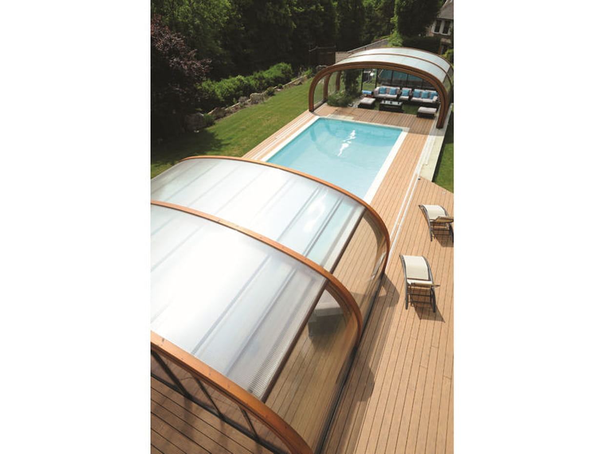 Une fois fermé, cet abri haut de piscine, avec structure en bois lamellé collé, crée une pièce supplémentaire dans le jardin.
