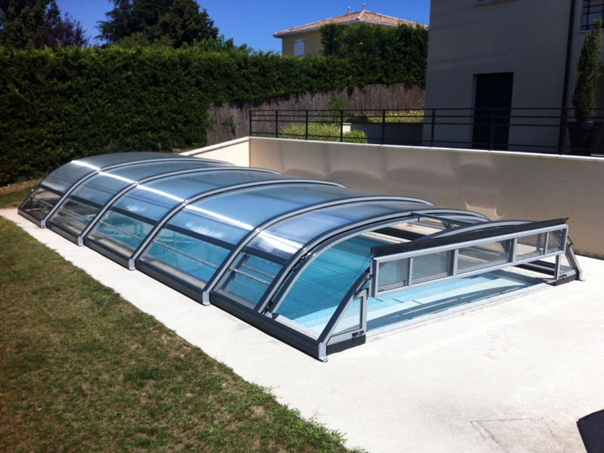 En aluminium et polycarbonate, cet abri permet de se baigner facilement, même en partie replié sur le bassin.