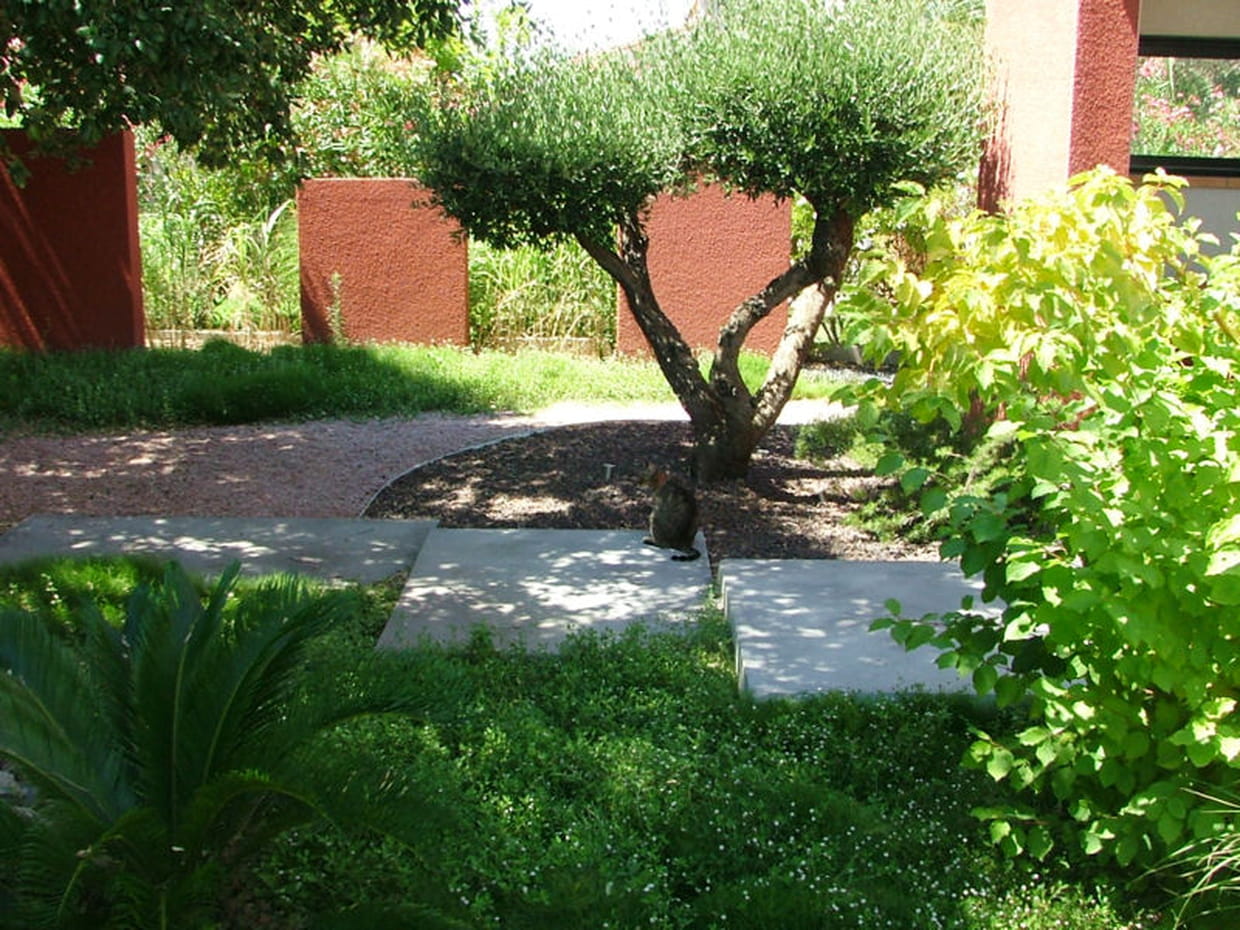 L'olivier a été taillé en nuages afin de présenter une belle allure de bonsaï qui colle ainsi au thème zen, mais aussi pour réduire les contraintes d'entretien. Au second plan, nous pouvons apercevoir les murets de différentes tailles qui ont été installés pour éliminer le vis-à-vis et dont l'efficacité est complétée par une végétation luxuriante, notamment des graminées qui ont atteint un mètre de hauteur.