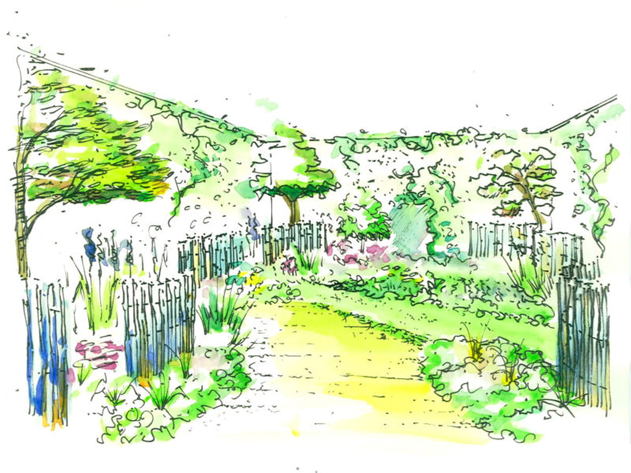 Le thème choisi par Alexandre Tonnerre pour aménager ce petit espace vert est celui du jardin à l'anglaise. Sur le croquis dessiné par le paysagiste, l'effet luxuriant et légèrement fouillis d'un jardin de ce style est parfaitement rendu, avec des rosiers et des grimpantes courant sur les ganivelles. L'idée était aussi de moderniser l'ensemble par des touches de couleurs, comme le bleu et le vert acidulé.
