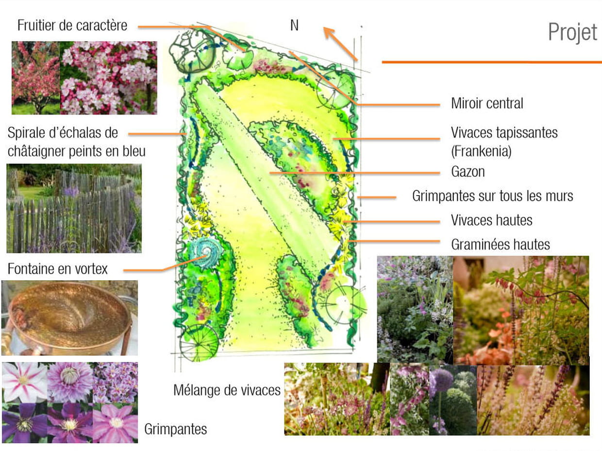 Sur ce plan avec propositions de plantations, un cheminement central de pelouse en diagonale se dessine. Sa forme participe à agrandir l'espace et à accentuer l'effet de perspective depuis la véranda. Autour, des vivaces tapissantes constituent une alternative au gazon traditionnel : la variété Frankenia n'a finalement pas été retenue et remplacée par de l'helxine, une plante verte couvre-sol résistante au piétinement.