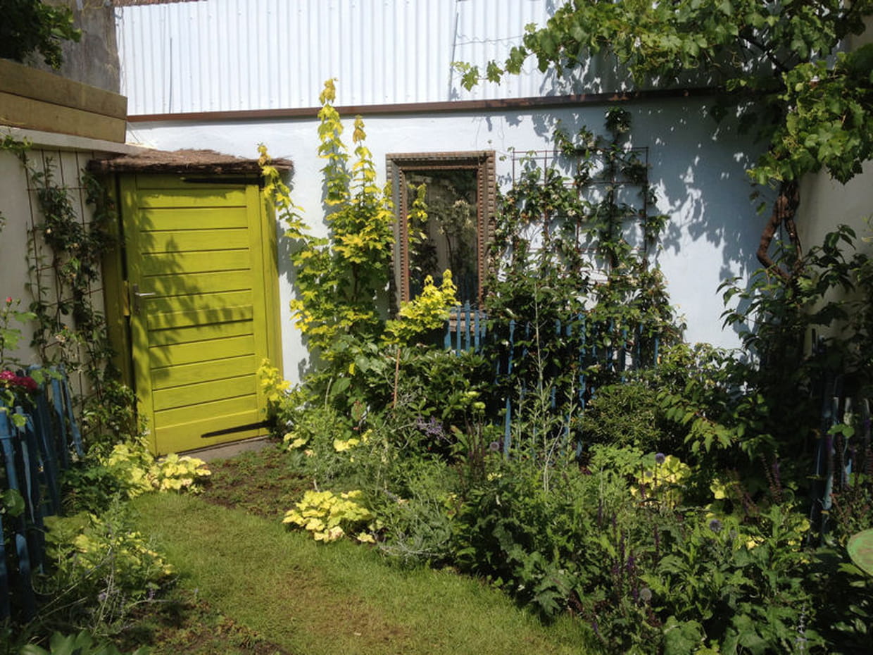 Après l'intervention du paysagiste Alexandre Tonnerre, le jardin est métamorphosé. Une porte peinte en vert est désormais installée au fond du jardin, laissant devinant qu'il y a autre chose derrière. Juste à côté, sur la gauche, le feuillage d'un érable de Princeton gold est en parfaite adéquation de couleur avec cet élément trompe-l'oeil. Un vert tendre que l'on retrouve également au sol avec les heuchères muscat.