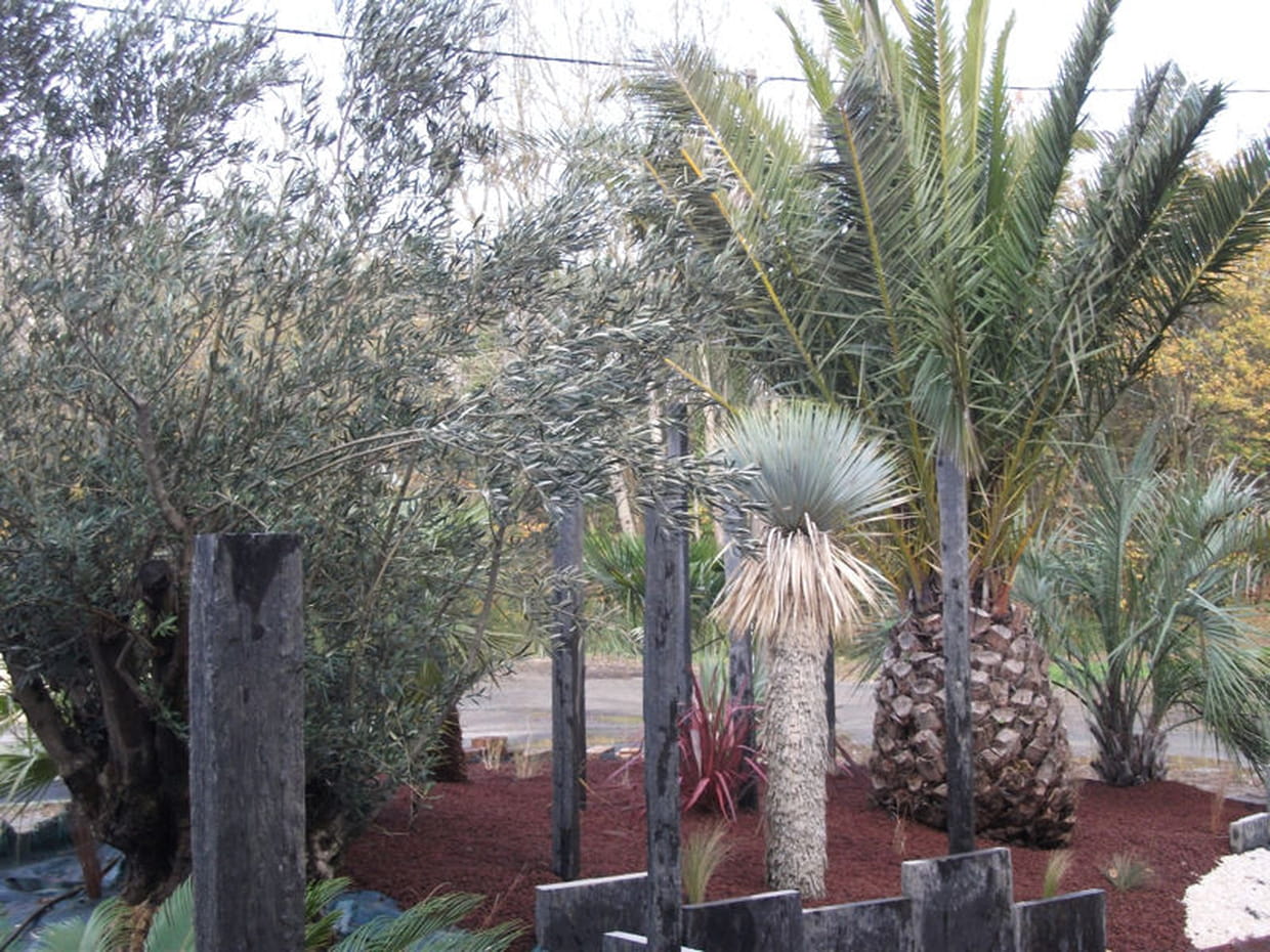 Différentes variétés de palmiers se côtoient sur ce massif : un gros Phoenix canariensis qui cache la vue, des dasylirions, des yuccas et des phormiums au feuillage rouge. On retrouve également un olivier, arbre emblématique des régions méridionales, âgé de 80 ans et qui arrive directement du Portugal. Au sol, un tapis de pouzzolane habille le massif et apporte de la couleur à cet espace. Les plantes grasses, qui pourtant nécessitent peu d'eau, ont été proscrites car elles ne résistent pas bien à la rigueur de l'hiver.