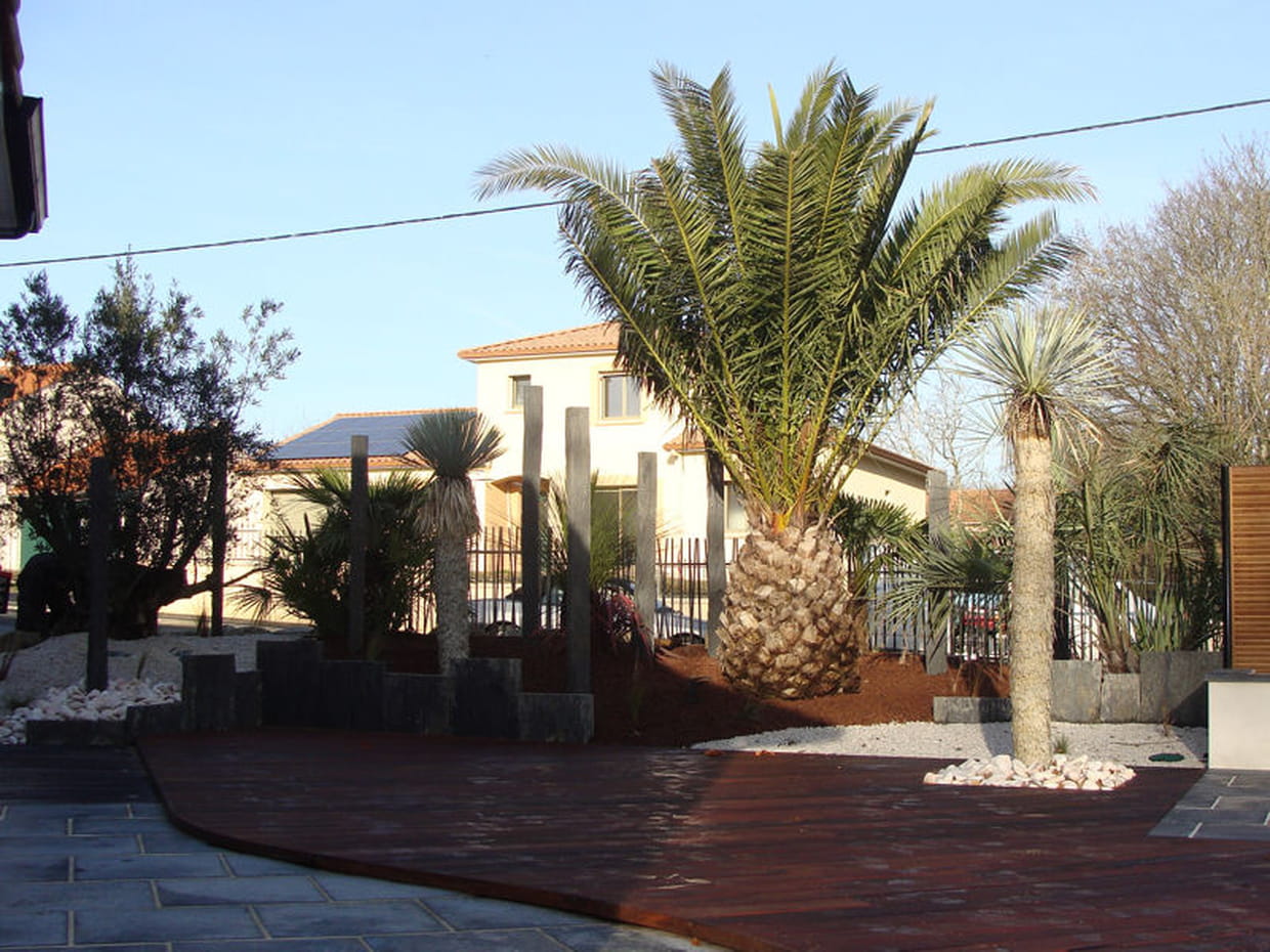 Découpe arrondie de la terrasse en bois, monolithes en quartzite noire juxtaposés et dressés tels des stèles, piquets en quartzite noir symétriques aux troncs rectilignes des yuccas rostrata... L'aménagement du jardin lui confère une structure graphique forte, entre lignes droites et courbes.