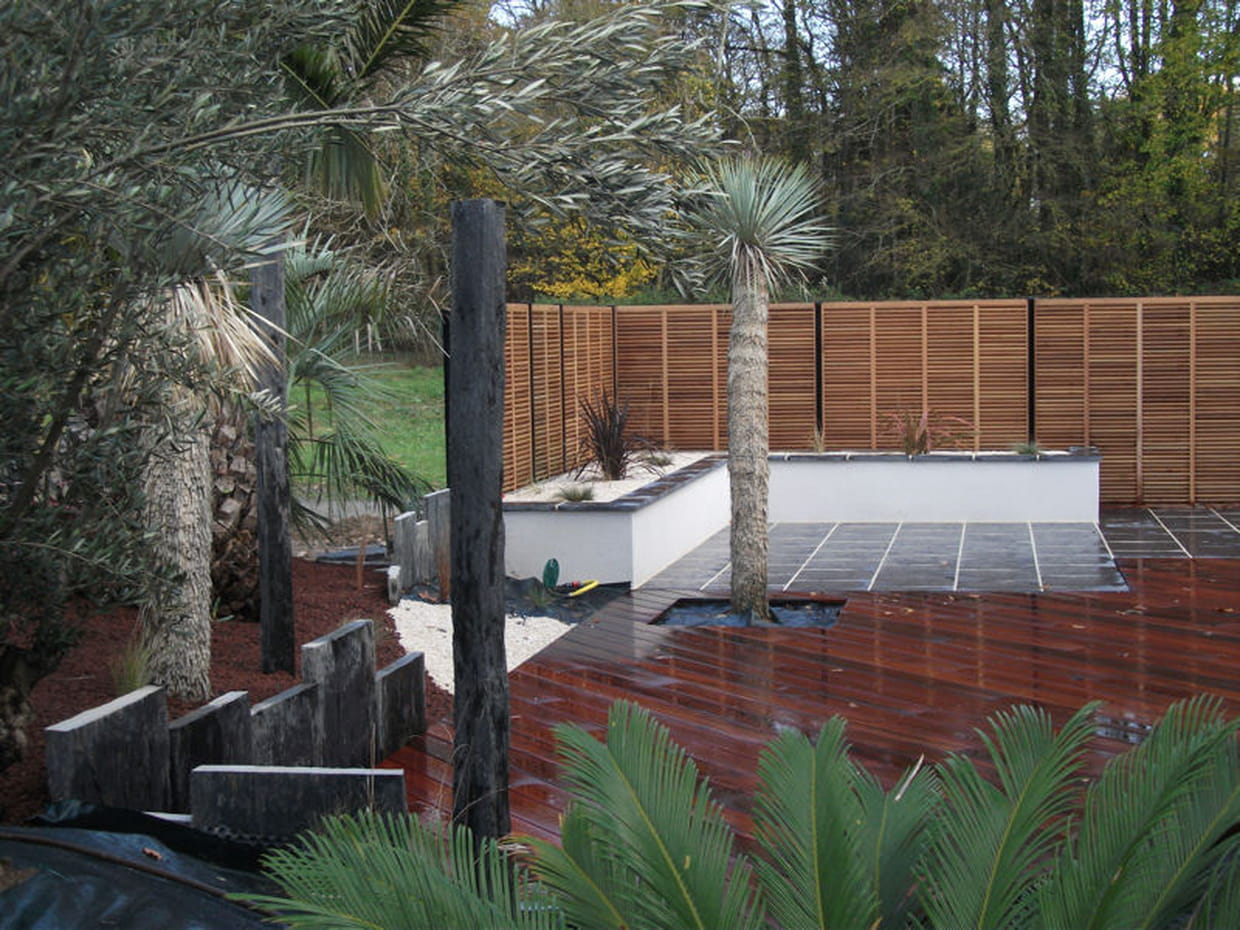 Depuis le massif de palmiers, la terrasse dévoile ses lignes graphiques, tandis que la nature pousse en toute liberté derrière la claustra en bois.