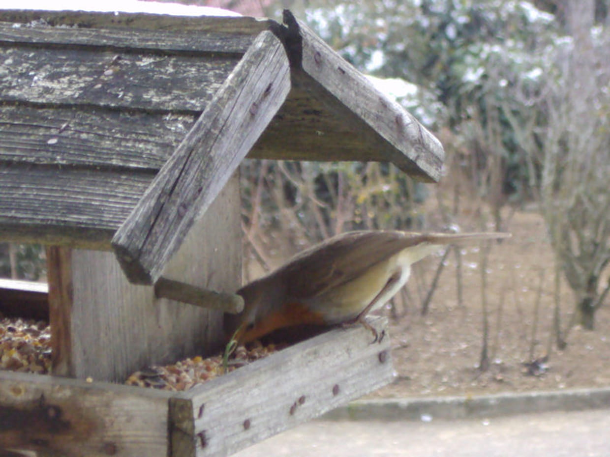 Ça et là dans son jardin, Michelle a installé des nichoirs, fabriqués maison par son petit cousin, pour nourrir les oiseaux en hiver. Ce qui lui permet de s'approcher d'eux, doucement, de leur parler, leur dire bonjour, puis les photographier, comme ce petit rouge-gorge.