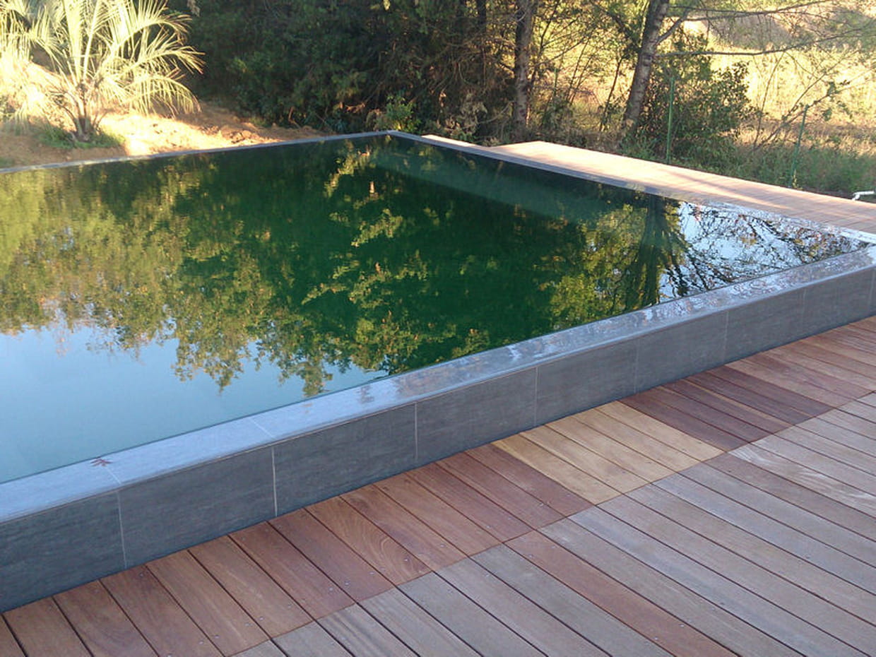 Cette piscine familiale à débordement, en béton structura feat, est recouverte de PVC aimé gris anthracite. Associée à cette plage en bois curamu, elle diffuse, dans ce jardin à l'état sauvage, son esprit zen.