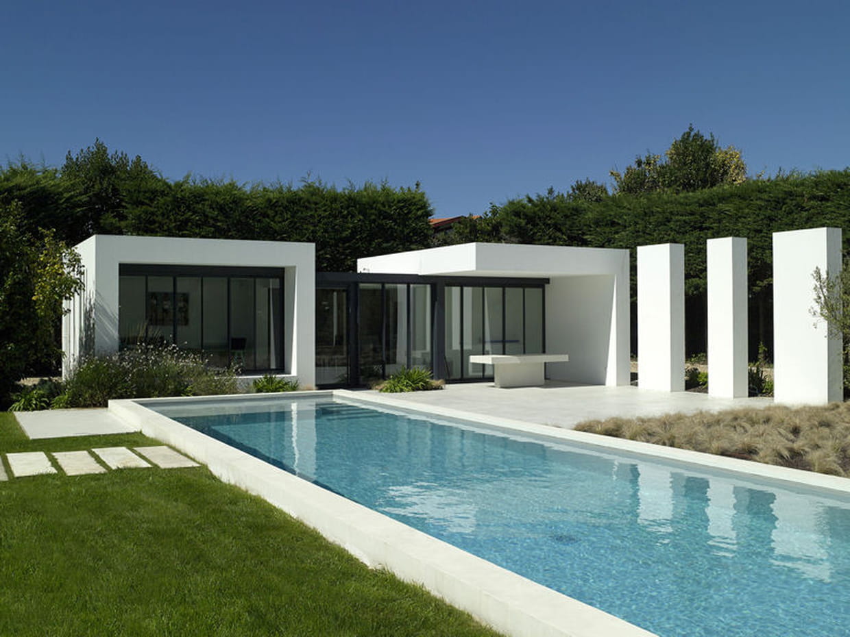 Très épurées, les lignes de cette piscine s'inscrivent dans l'architecture et les perspectives de cette maison résolument contemporaine.