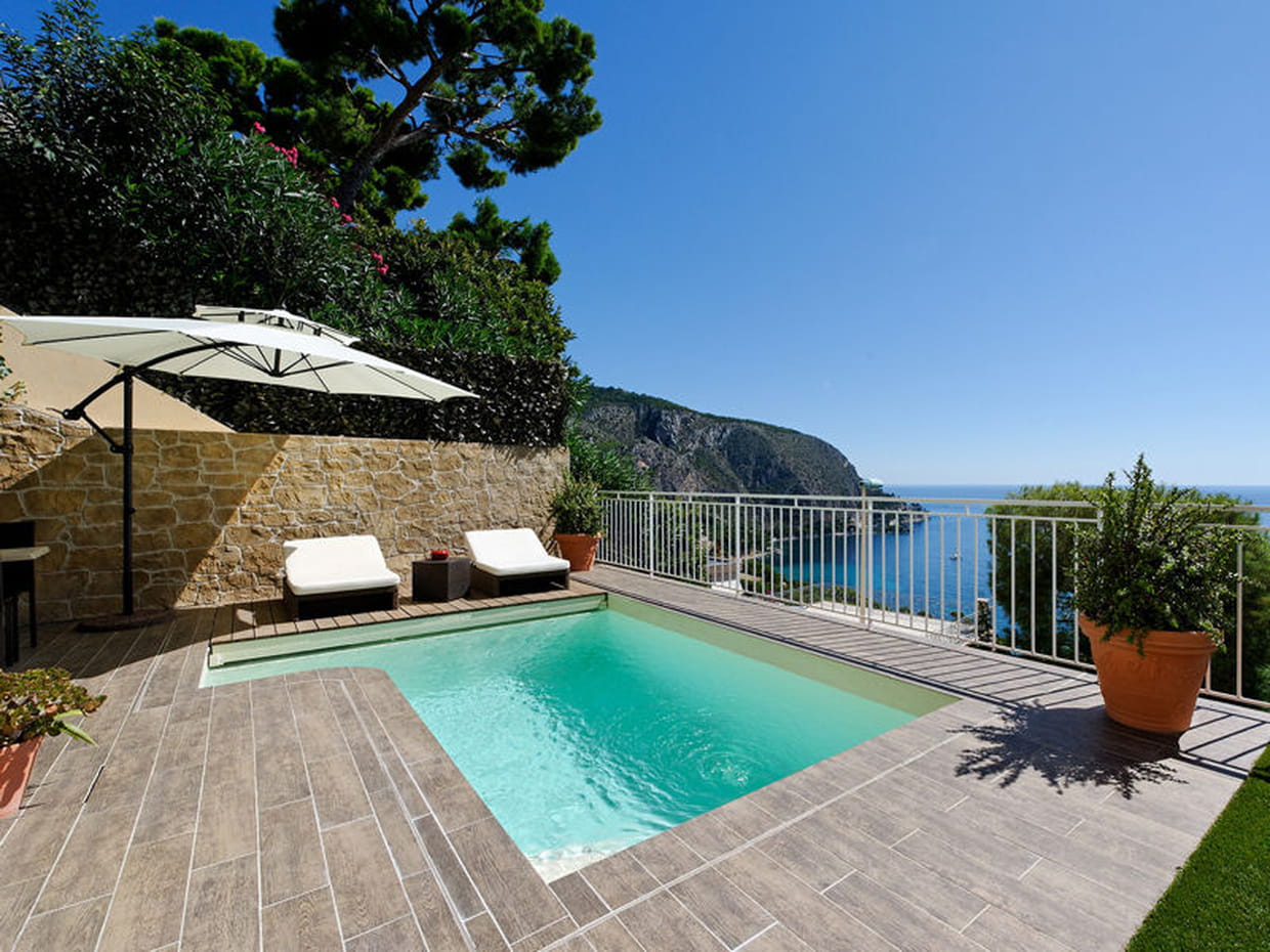 Construite sur une terrasse suspendue, cette petite piscine en béton armé et recouverte de résine polyester sable est équipée d'une plage et de margelles en grès cérame imitation bois.