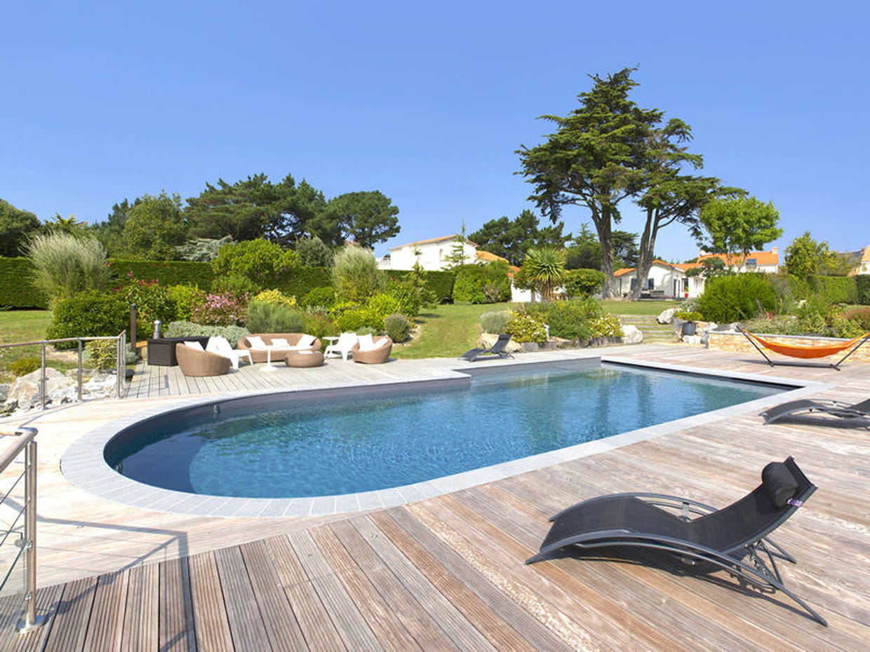 Cette piscine, en béton armé, a été construite à l'emplacement d'un étang. Celui-ci a été en partie préservé en contrebas. Une membrane armée 150/100e gris renforce l'étanchéité de cette réalisation. Le contraste de matériaux employés (plage en ipé et margelles en granit) accentue les lignes de cette piscine.
