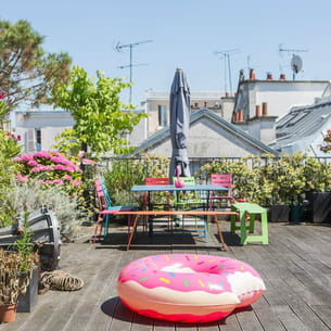 Sur ce rooftop avec vue sur les toits parisiens, place à une décoration haute en couleur et fun à souhait. De la salle à manger fluo à la bouée donut, sans oublier les fleurs et plantes à gogo, tout ici nous fait oublier que l'on est à Paris. Visitez cet exubérant duplex avec rooftop