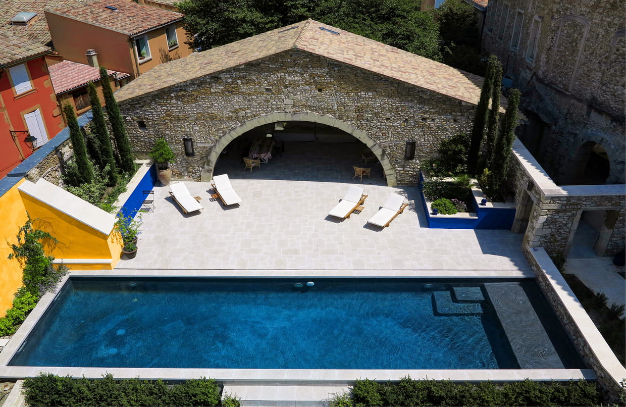 Cette piscine rectangulaire est faite de gunite et recouverte de plaster gris clair. Le "diffaclean", "diffapur", la pompe à chaleur ainsi que les LEDs de couleurs, en option, ont été ajoutés.