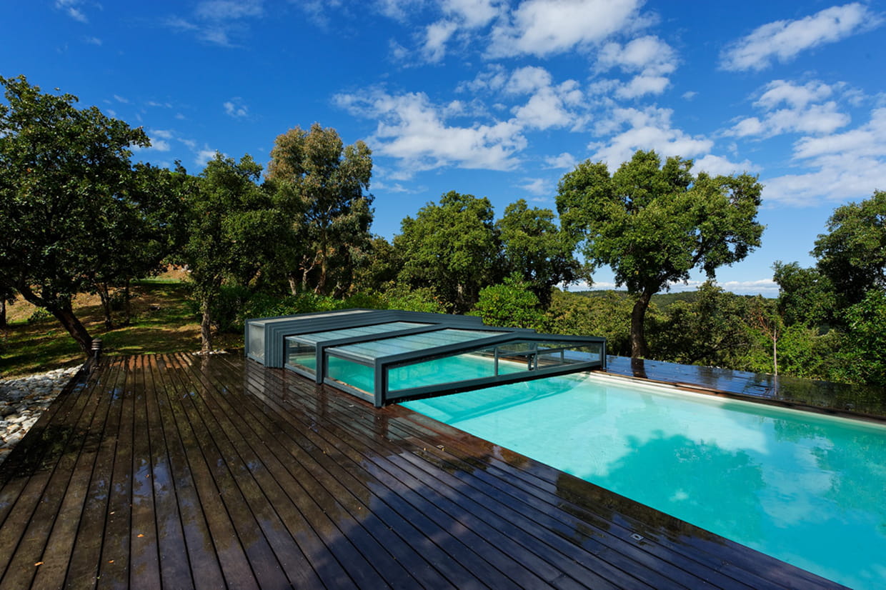 Cet abri en aluminium thermo laqué gris est doté de parties latérales en plexi transparent de 3 mm et d'une tribune en polycarbonate. L'alvéolaire transparente de 8 mm permet de protéger le bassin.
