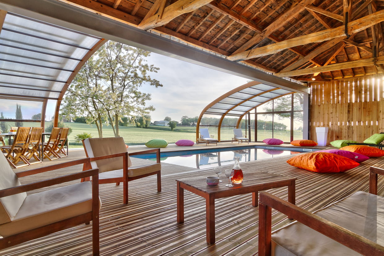 Cet abri en bois lamellé, aluminium et polycarbonate peut replier ses portes sur chacun de ses côtés.