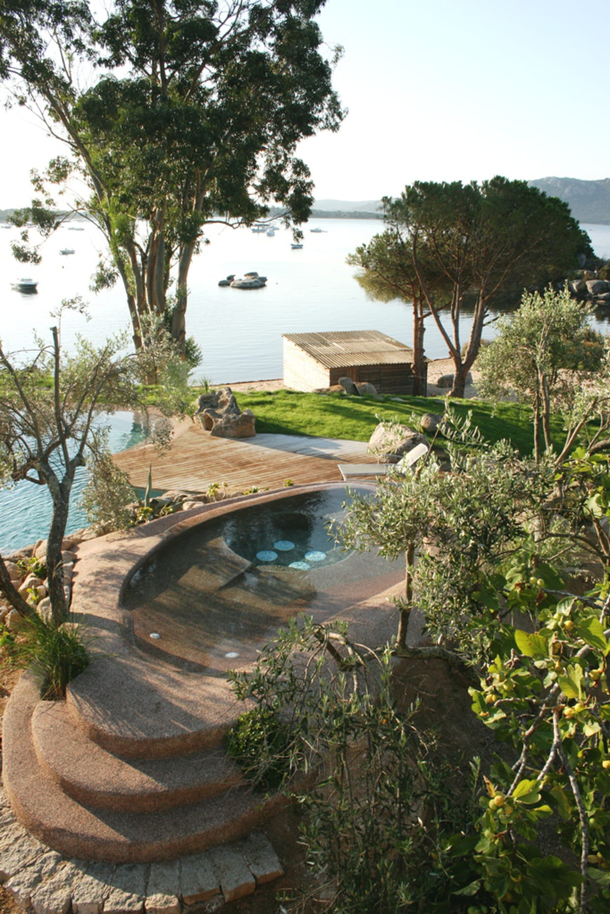 Ces spa et piscine sont réalisés en monobloc béton, procédé leaderpool, et habillés de petranita. Ici la plage est immergée. Leur particularité ? Leur déversoir en cascade qui leur a valu le trophée d'or, dans la catégorie spa innovant.