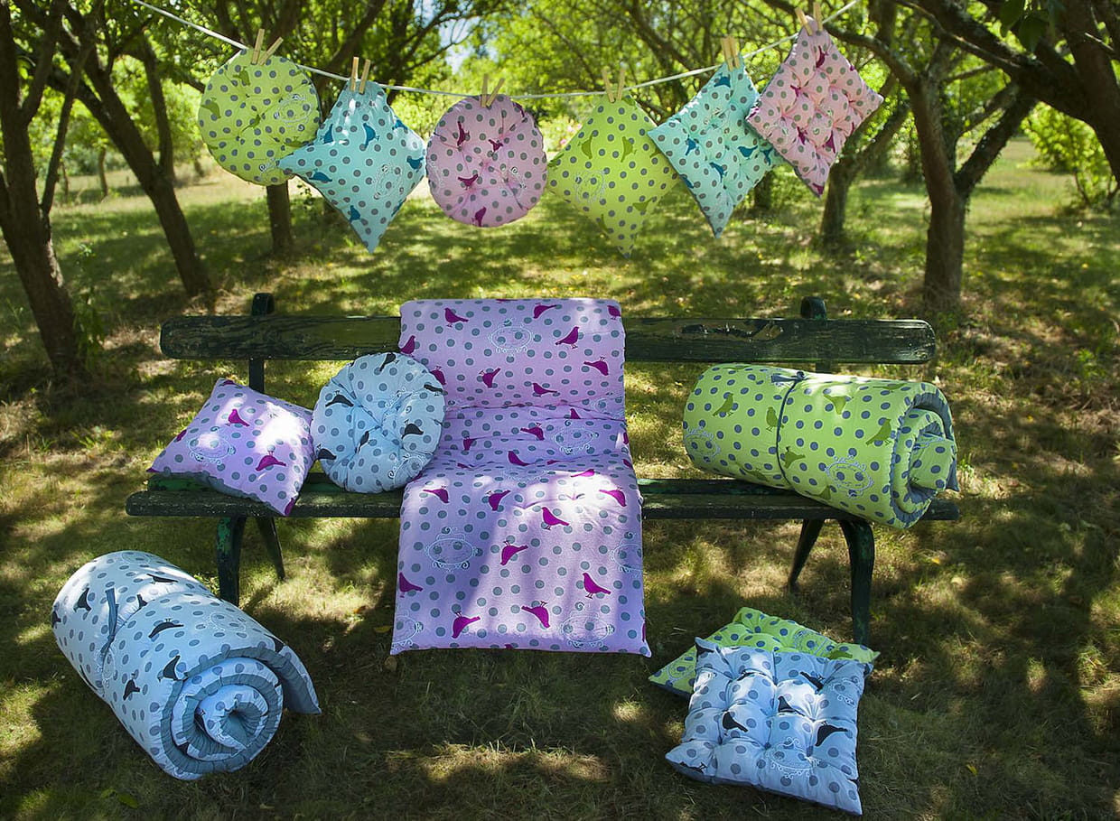 Matelas futon et assises futon rondes et carrées BIRDY de Jardin Privé. Prix : 44,90 euros et 7,90 euros l'unité. Site : www.jardin-prive.fr