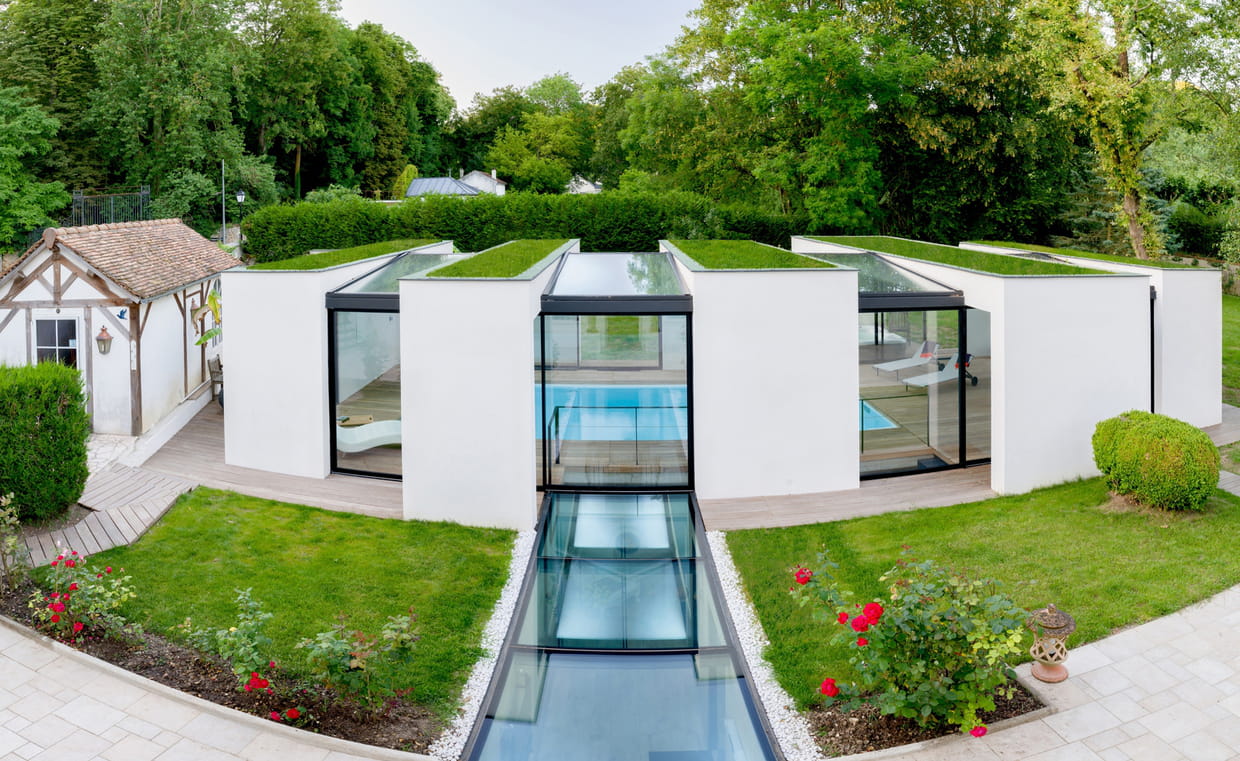 Sous une structure mêlant murs et vitres, cette piscine de 40 m² joue le grand luxe. Aussi, elle est accessible depuis la maison via un tunnel. Parfait pour l'hiver !