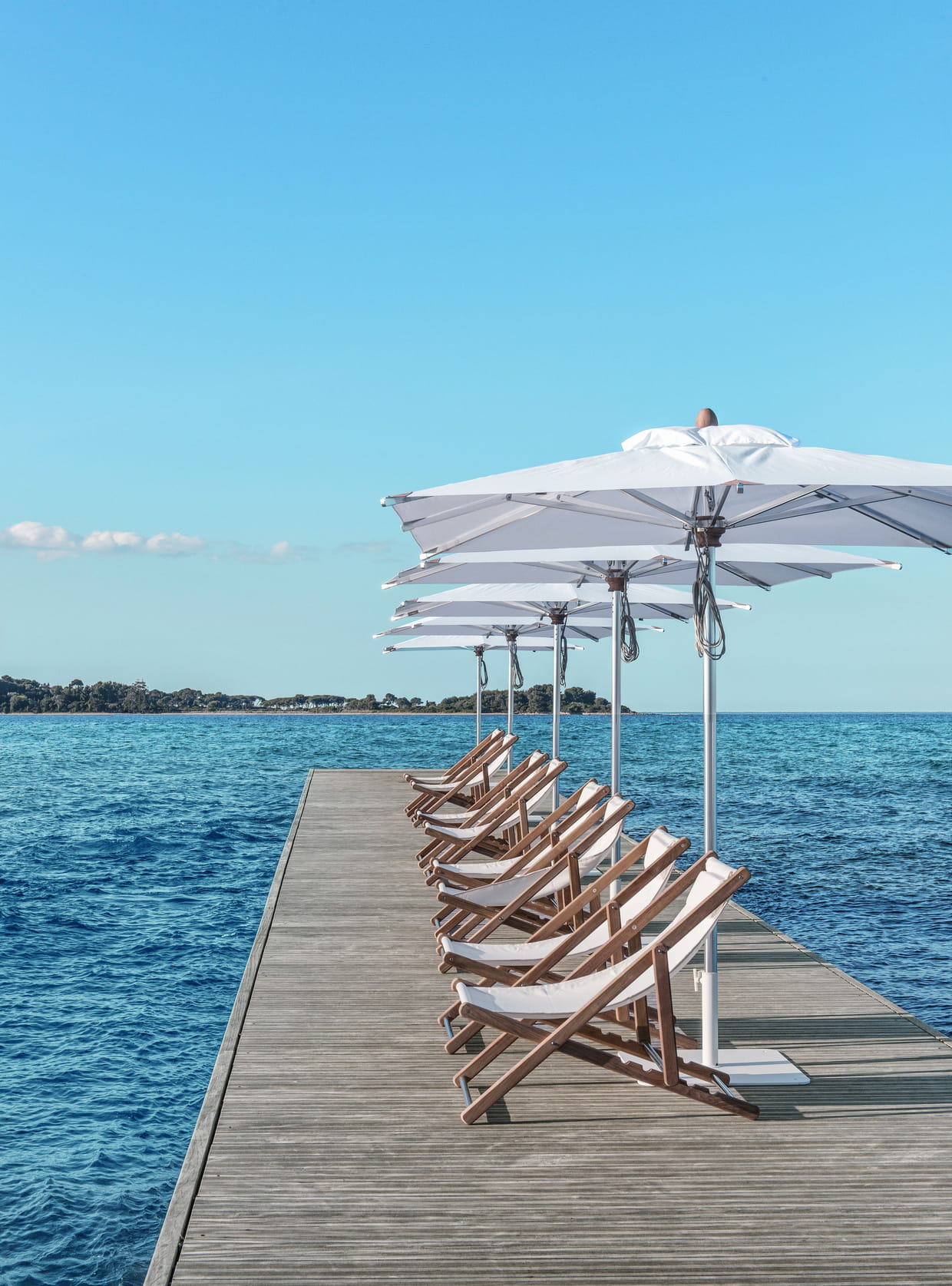 Chilienne en teck décapé et tissu, par Ethimo. Prix : 395 euros. Où l'acheter ? www.ethimo.com
