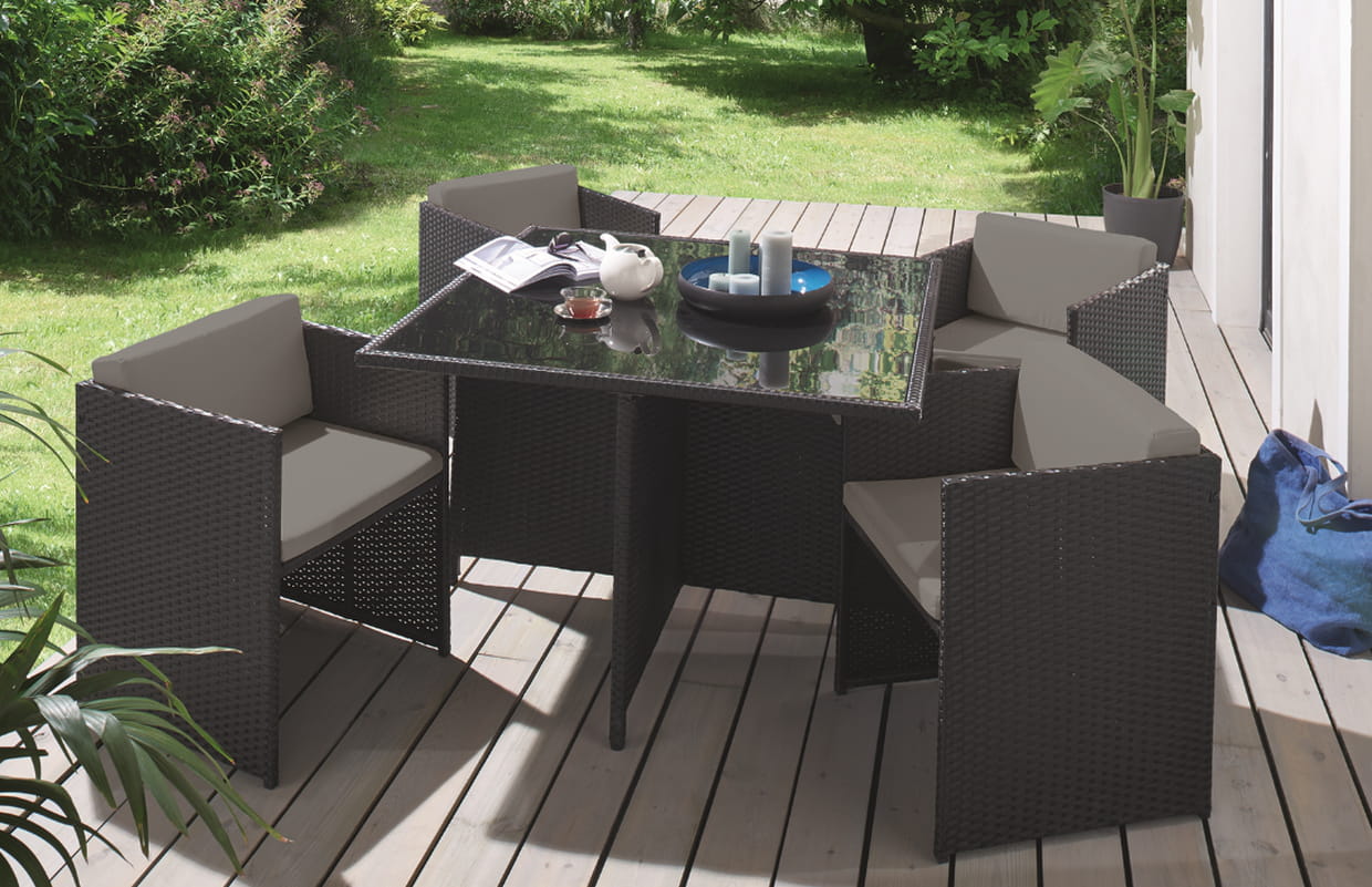 Mobilier de jardin Andreas de Conforama avec une table (dimensions 115 x 115 x 74 cm) et 4 fauteuils en plastique et verre trempé. Prix : 369,99 euros l'ensemble table et 4 fauteuils. Où l'acheter ? www.conforama.fr