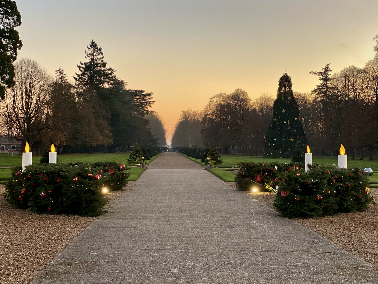 Décorée avec soin, l'allée principale menant du château de Cheverny à ses jardins met en scène des buissons remplis de cadeaux, mais pas que.
