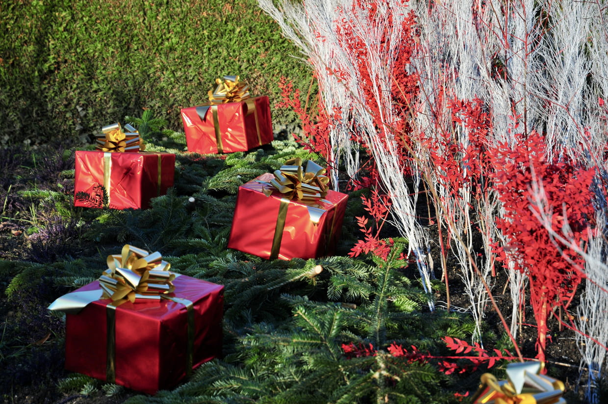 Que serait Noël sans cadeaux ? Disséminés un peu partout dans les jardins du Château de Cheverny, des présents bien emballés surmontés de gros nœuds nous font de l’œil et pas qu'un peu.