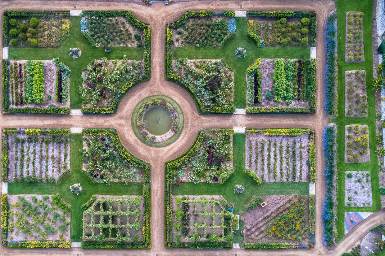 Quand on le détaille d'en haut, le potager conservatoire d'un hectare dévoile sa belle symétrie.