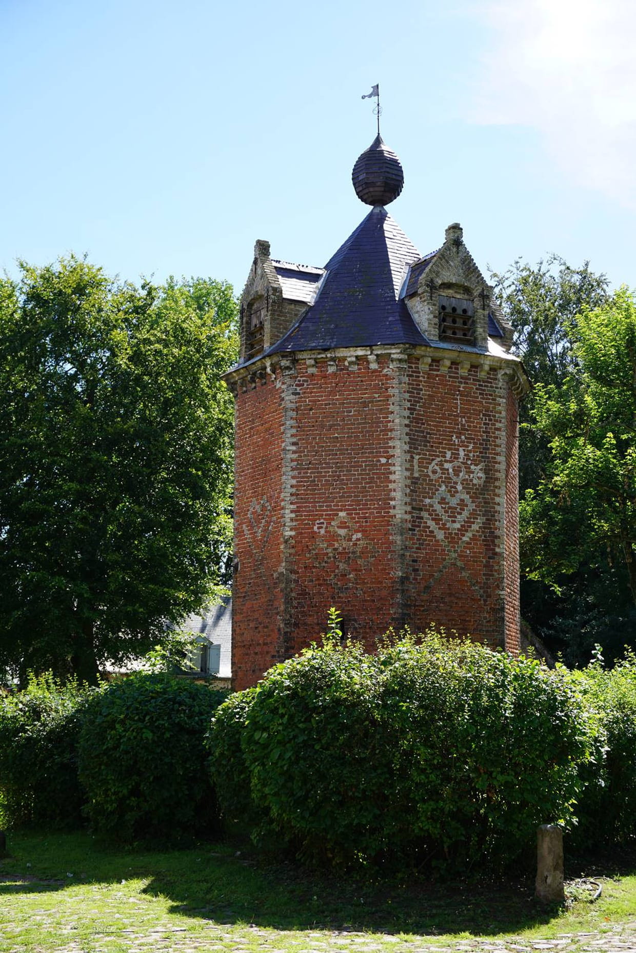 Une fois la grille de la cour d'entrée passée, la visite peut commencer. Au centre de ce premier espace, place à un colombier en briques surmonté d'un bulbe en ardoises. Pour connaître sa date de construction, il suffit de regarder de plus près. Ainsi vous verrez apparaître, inscrits dans la brique, les chiffres 1606.
