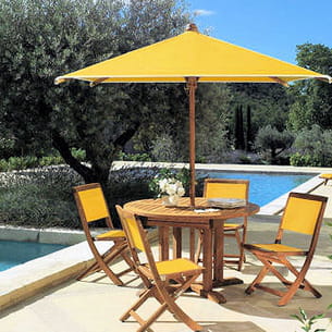 Il flotte comme un parfum de sud grâce à cet ensemble coloré, composé d'une table, de quatre chaises et d'un parasol. Tout en teck, le salon est accompagné d'une toile d'assise couleur Batyline Natural Bouton d'or/cendre.