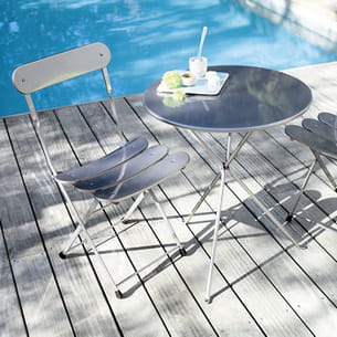 Pratique, pliant, facile d'entretien et léger, ce petit salon est idéal pour les petites surfaces, comme les balcons, ou comme table d'appoint. Il est composé d'une table et de deux chaises, en métal traité anti-corrosion, revêtu de polyester coloris alu. Le tout est garanti 3 ans.