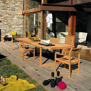 D'inspiration classique, ce salon aux allures contemporaines, à lattes en teck TFT, conviendra parfaitement aux grandes fratries. La table dispose d'une rallonge. A savoir : cette gamme décline tout le mobilier nécessaire pour le plein air, comme un coffre, des chaises longues, sans oublier une douche extérieure.